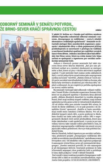 V pátek 23. května se v Senátu pod záštitou senátora Zdeňka Papouška uskutečnil odborný seminář s názvem „Desegregace ve vzdělávání – cesta k silnější ekonomice a stabilnější společnosti“. Semináře se zúčastnili zástupci škol, neziskových organizací, samospráv i akademické sféry s cílem pojmenovat příčiny prohlubujících se nerovností v přístupu ke vzdělání a navrhnout konkrétní opatření pro zajištění rovných šancí všem dětem. Jedním z iniciátorů akce byla Městská část Brno-sever, která na svém území toto téma začíná ve spolupráci s Agenturou pro sociální začleňování intenzivně řešit.